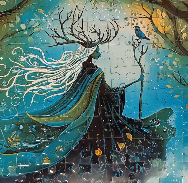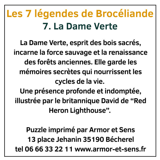 Esprit des bois sacrés, La Dame Verte incarne la force sauvage et la renaissance des forêts anciennes. Elle veille sur les mémoires secrètes que les arbres transmettent au fil des saisons, gardienne des cycles qui nourrissent la vie et la régénèrent. Dans ce puzzle, elle apparaît au cœur d’une nature vibrante, entourée de feuillages, d’oiseaux et de souffles qui semblent naître de la terre elle‑même. Sa silhouette, à la fois majestueuse et indomptée, évoque une présence profonde, ancrée dans les racines du monde. Une célébration de la puissance des forêts, de leur mystère et de leur capacité à renaître sans cesse.