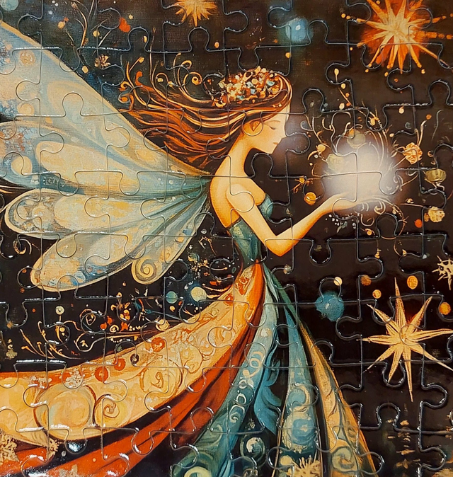 Gardienne des frontières subtiles, Mélusine veille sur les lieux où les mondes se frôlent et se répondent. Elle écoute les murmures des passages invisibles, là où les réalités se superposent et où les secrets circulent comme un souffle léger. Dans ce puzzle, elle apparaît au cœur d’un ciel vibrant, entourée d’étoiles, de volutes et d’énergies qui dansent autour d’elle. Sa présence est celle d’une fée des seuils : protectrice, messagère, guide des chemins qui relient Bécherel aux terres enchantées de Brocéliande. Une évocation lumineuse et magique des lisières, ces espaces précieux où tout peut basculer, se révéler ou s’ouvrir.